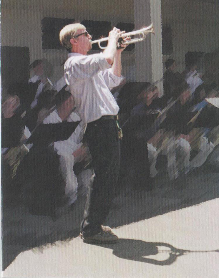 Mr. Dunan plays his trumpet passionately and the tones flow forth, quietly, then in staccato, again returning to calm. This concept changed my path of thoughts, encouraging me to notice the difference between quiet and strong, I captured the temperament of the musician, blissfully overwhelmed by his musical passion.